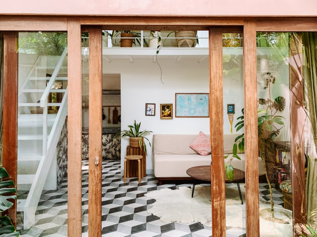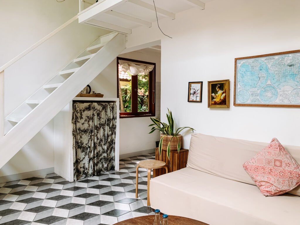 Experience a warm Balinese atmosphere as you enter the property through a courtyard lined with tropical plants and pink bougainvillea that complement the traditional exterior walls. The setting creates a welcoming and peaceful environment, ideal for those looking for a comfortable place to stay for the long term.